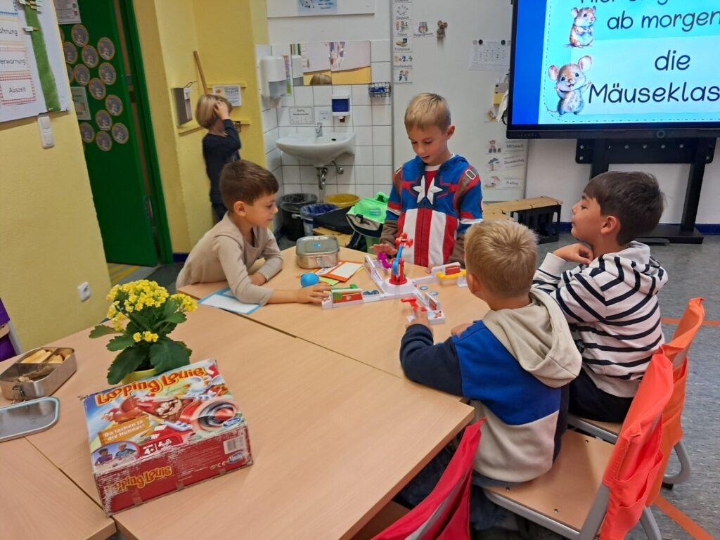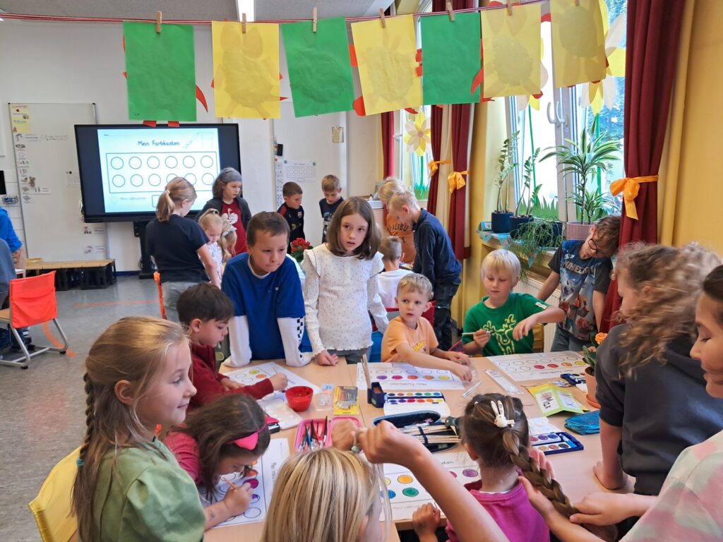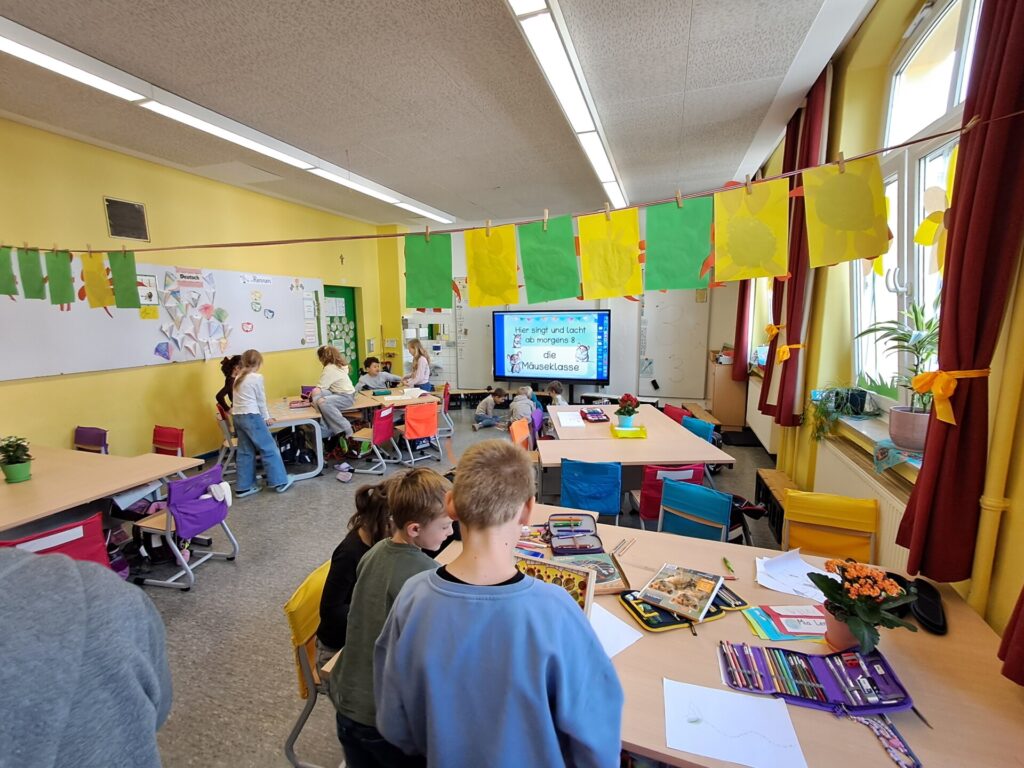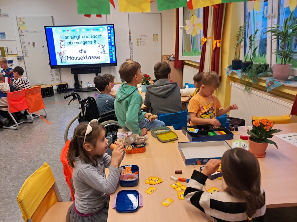 Unsere ersten Schultage verbrachten wir mit Mimi Maus im Morgenkreis, mit Lola und dem Buchstabenrap, mit Mini und Max aus dem Mathebuch. Wir spielten und lernten mit unseren Paten, die uns schon ganz viel halfen. Zusammen frühstückten, spielten, lernten und sangen wir. Die ersten Buchstaben und Ziffern übten wir mit allen Sinnen an Stationen. Auch das Schullied sangen wir fleißig. Inzwischen kennen wir uns sehr gut aus Am Krausen Bäumchen!