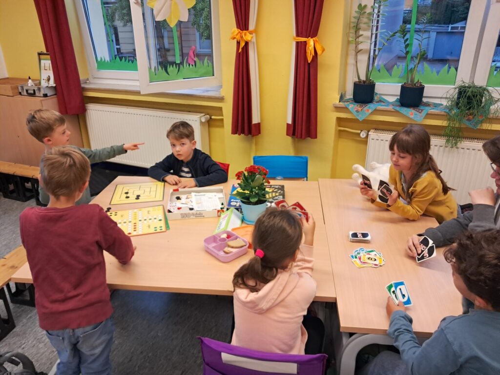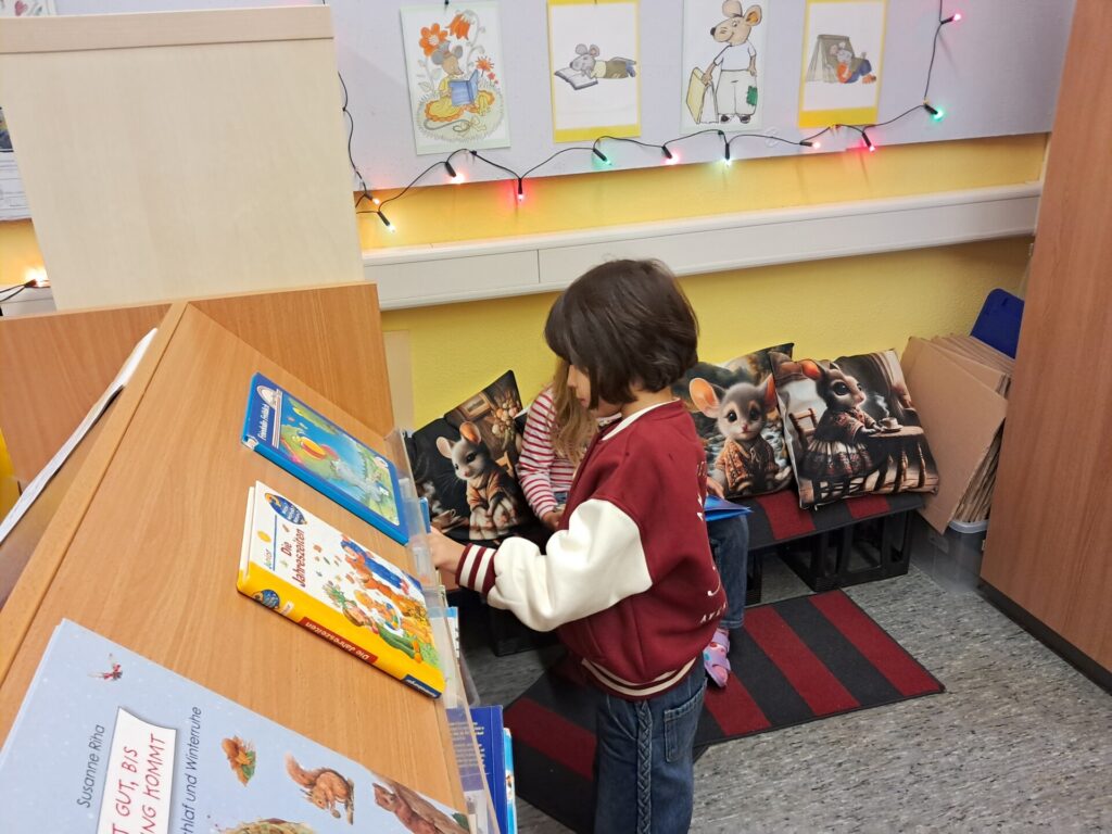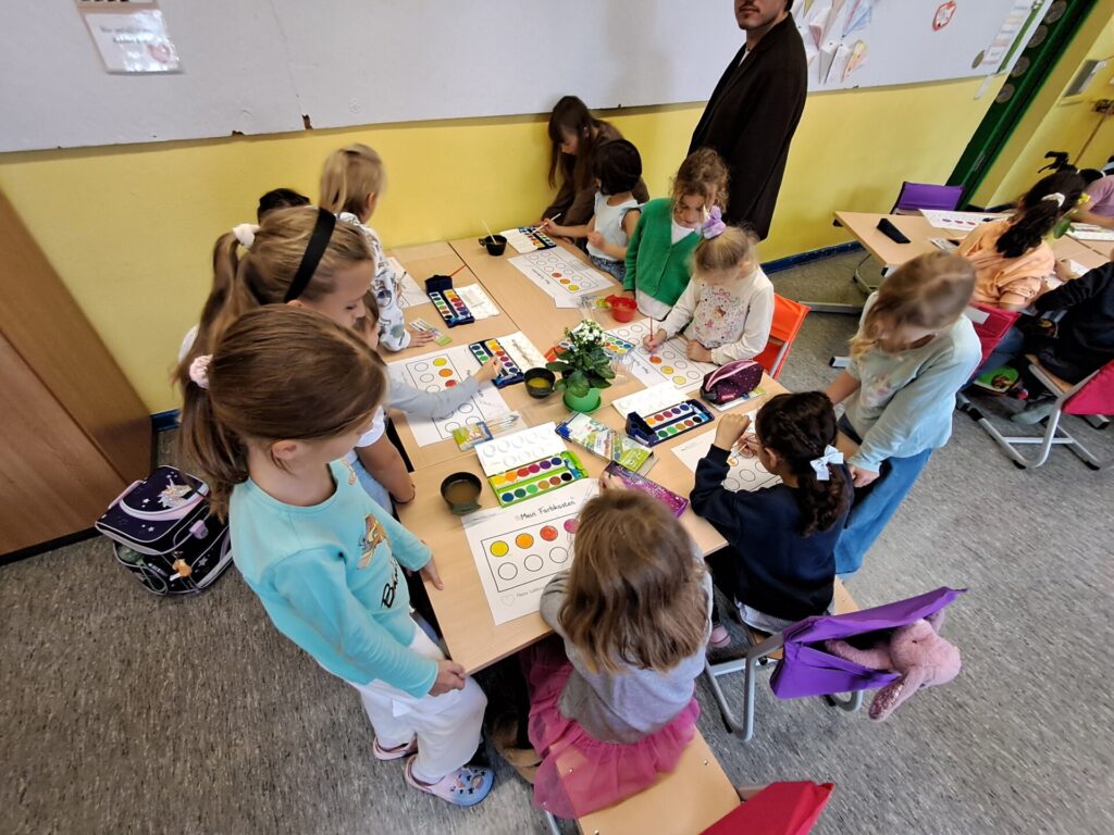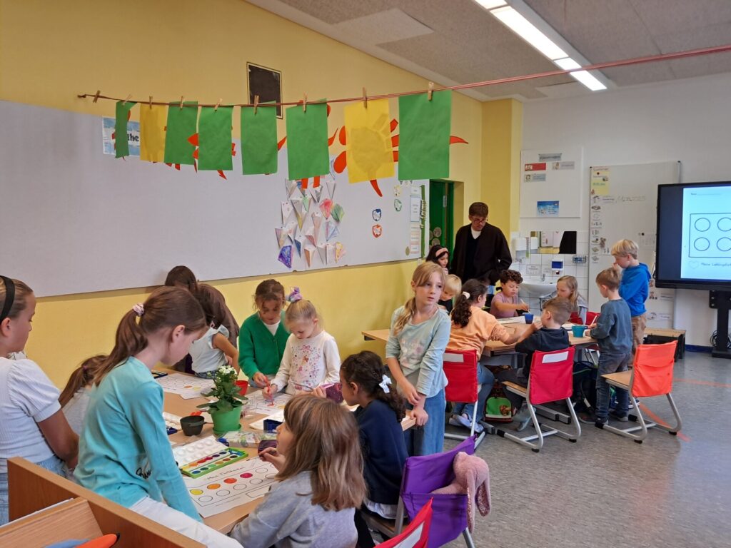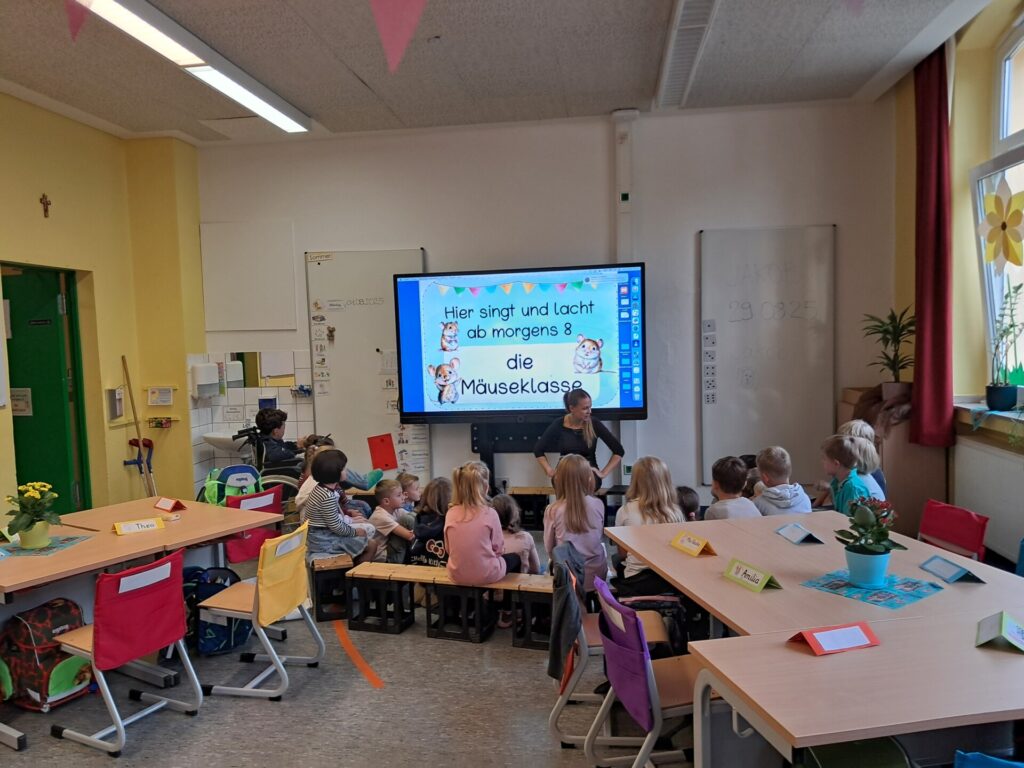 Unsere ersten Schultage verbrachten wir mit Mimi Maus im Morgenkreis, mit Lola und dem Buchstabenrap, mit Mini und Max aus dem Mathebuch. Wir spielten und lernten mit unseren Paten, die uns schon ganz viel halfen. Zusammen frühstückten, spielten, lernten und sangen wir. Die ersten Buchstaben und Ziffern übten wir mit allen Sinnen an Stationen. Auch das Schullied sangen wir fleißig. Inzwischen kennen wir uns sehr gut aus Am Krausen Bäumchen!