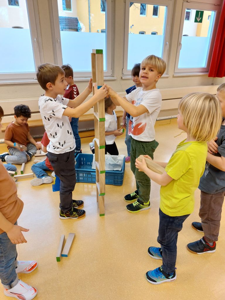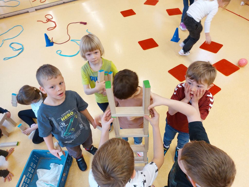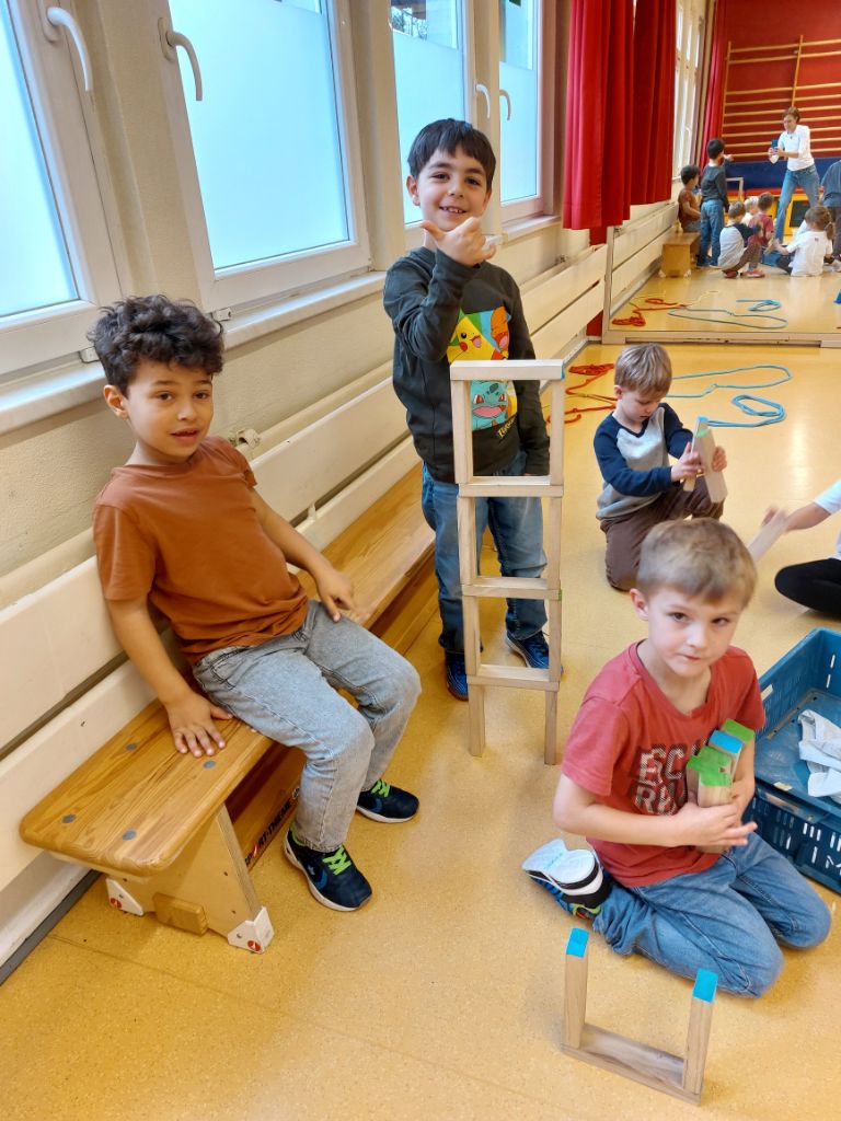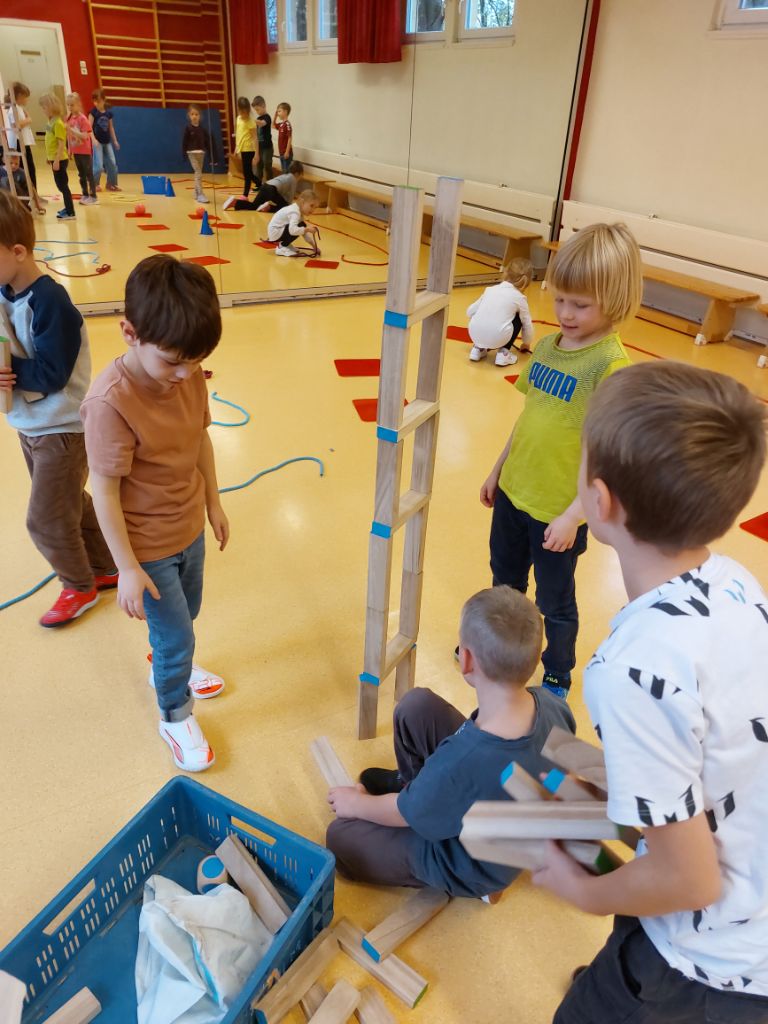 In unserem gut ausgestatteten Bewegungsraum durften wir mit Frau Pfundner verschiedene Bauten bauen und uns fächerübergreifend bewegen.