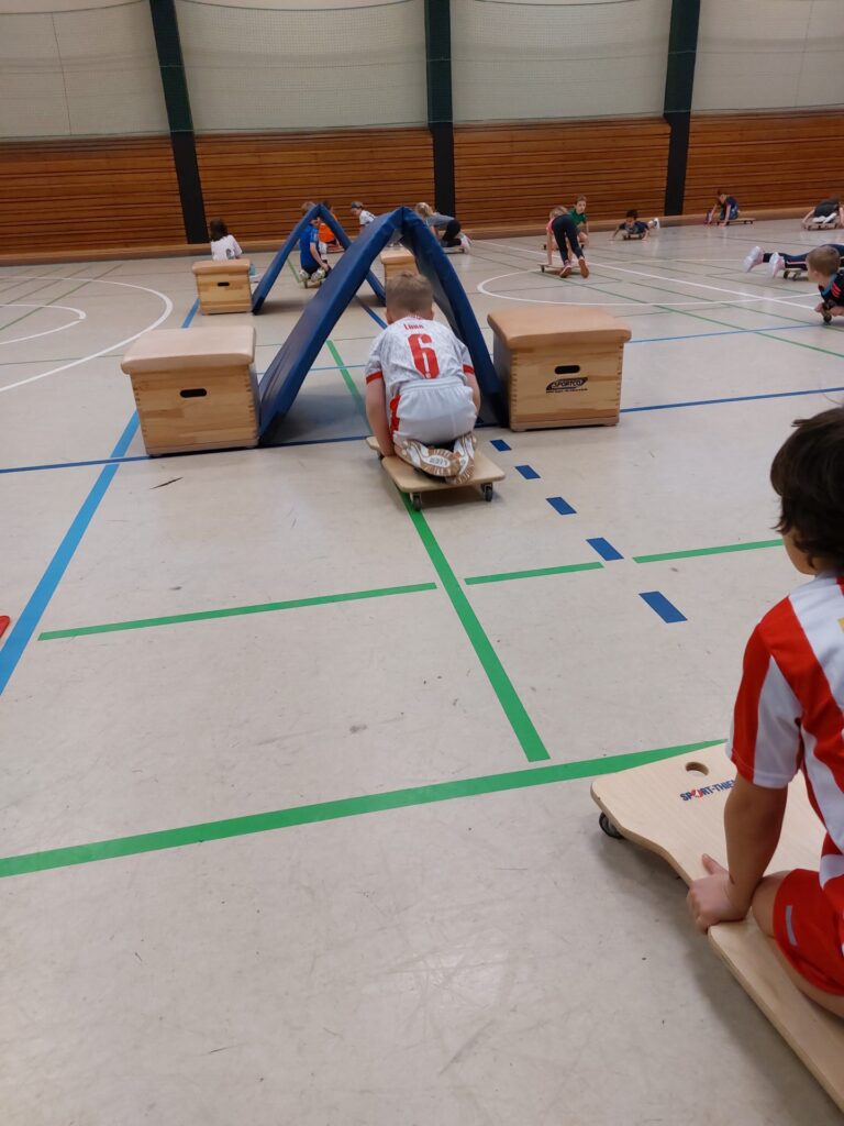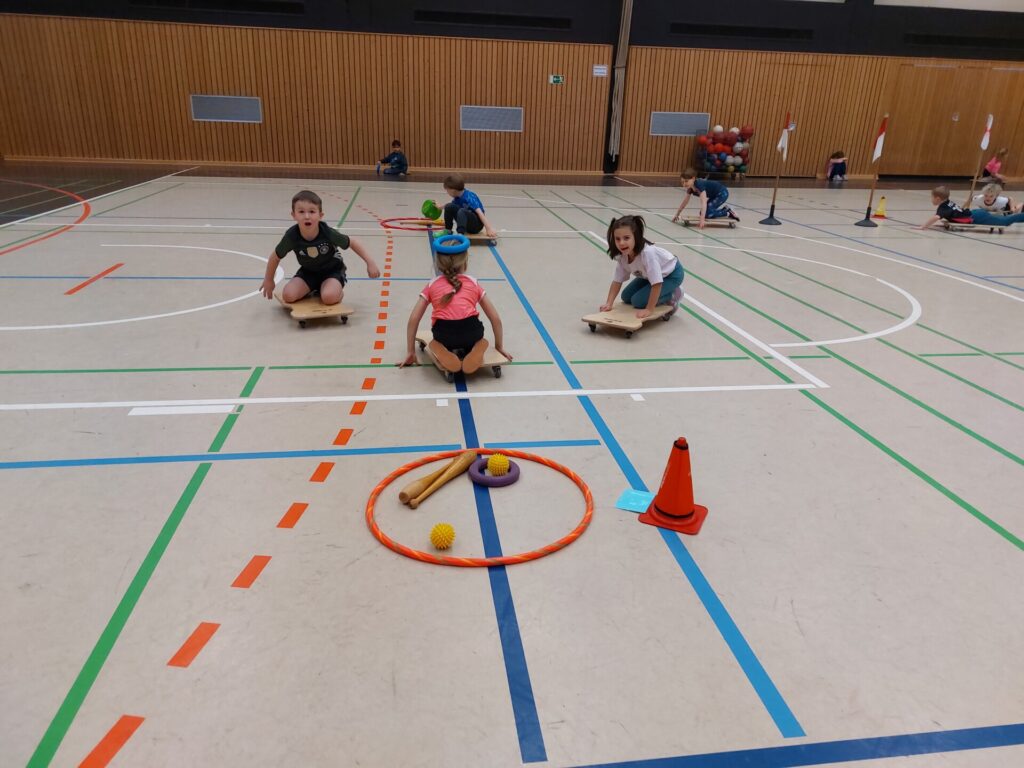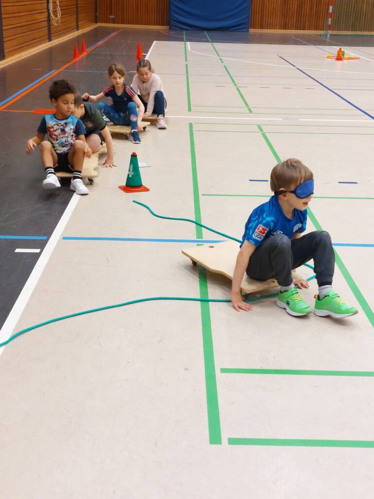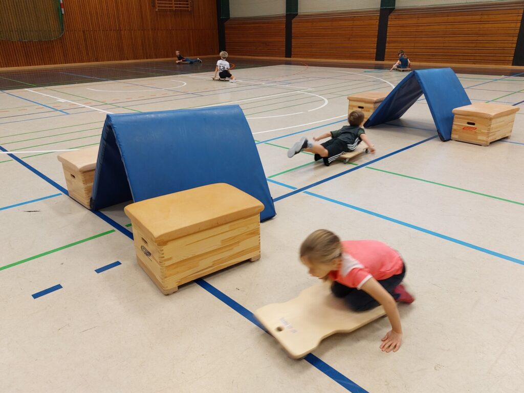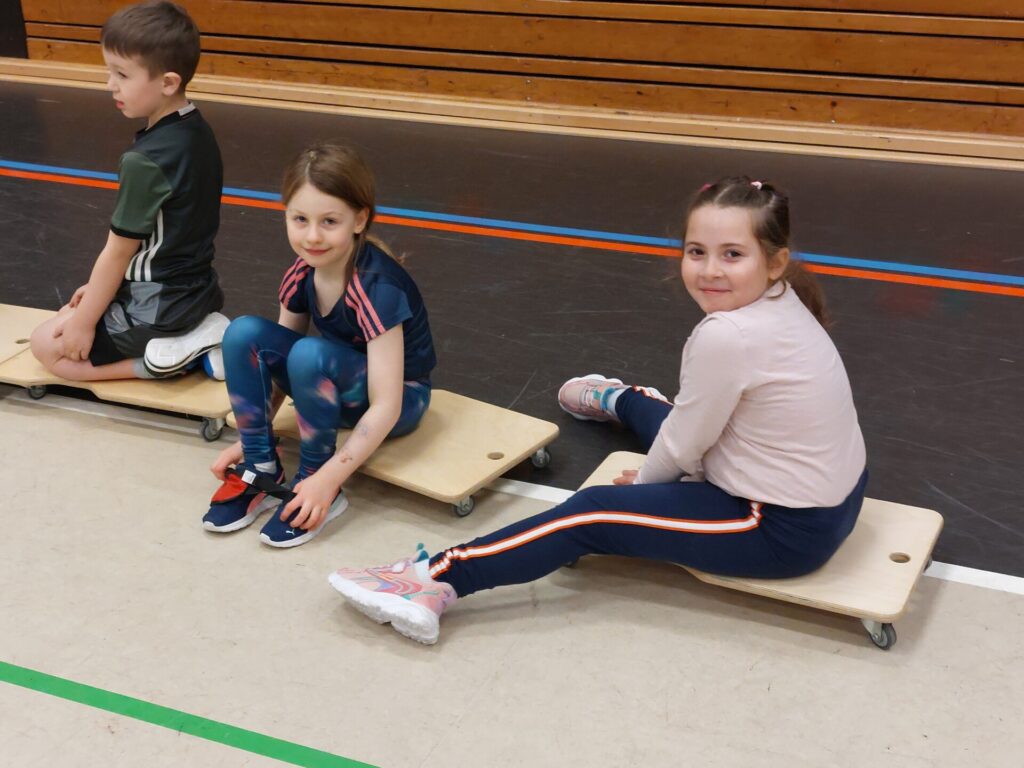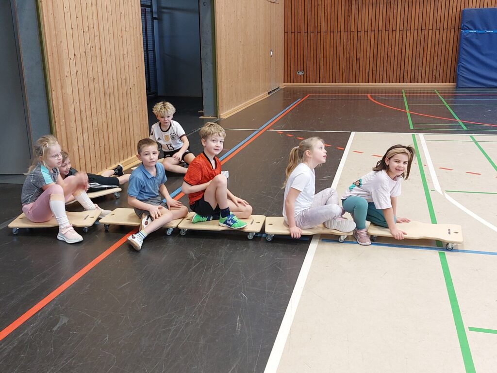 Danach haben wir dann weiter an unterschiedlichen Stationen das Rollen, Fahren und auch Bremsen mit den Rollbrettern geübt. Das hat allen sehr viel Spaß gemacht. Außerdem haben wir so neue Bewegungsmöglichkeiten im Sportunterricht kennengelernt.