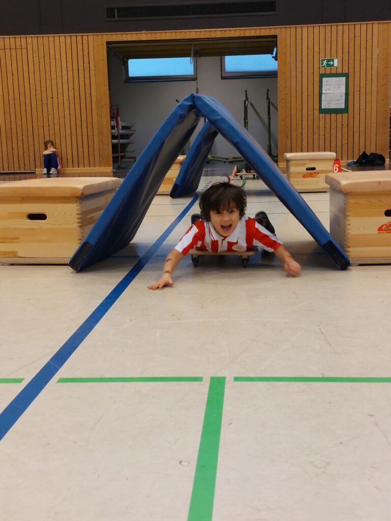 Unterwegs mit den Rollbrettern waren wir an verschiedenen Stationen in der Turnhalle. Zunächst haben wir das Fahren geübt – erst langsam, dann auch etwas schneller. Zudem mussten wir natürlich auch das Bremsen üben.