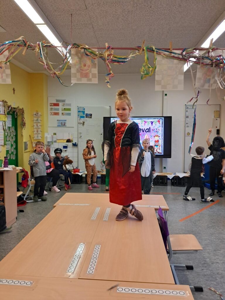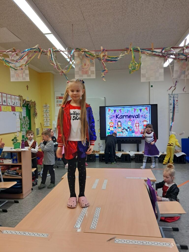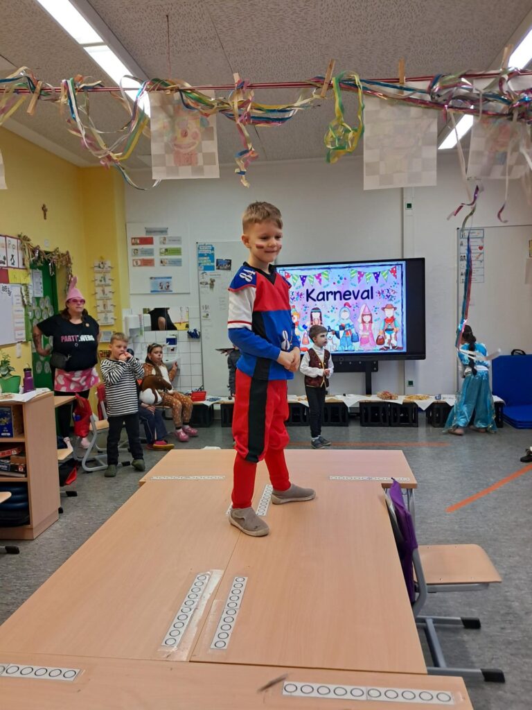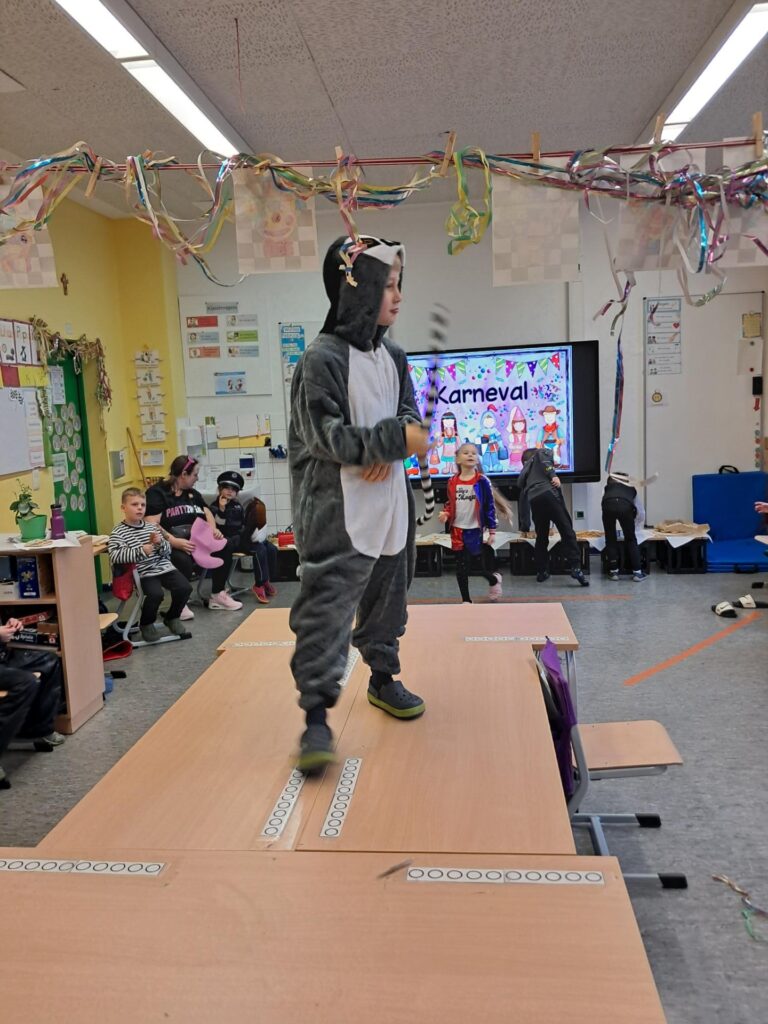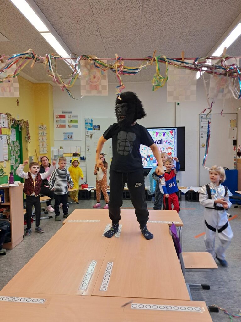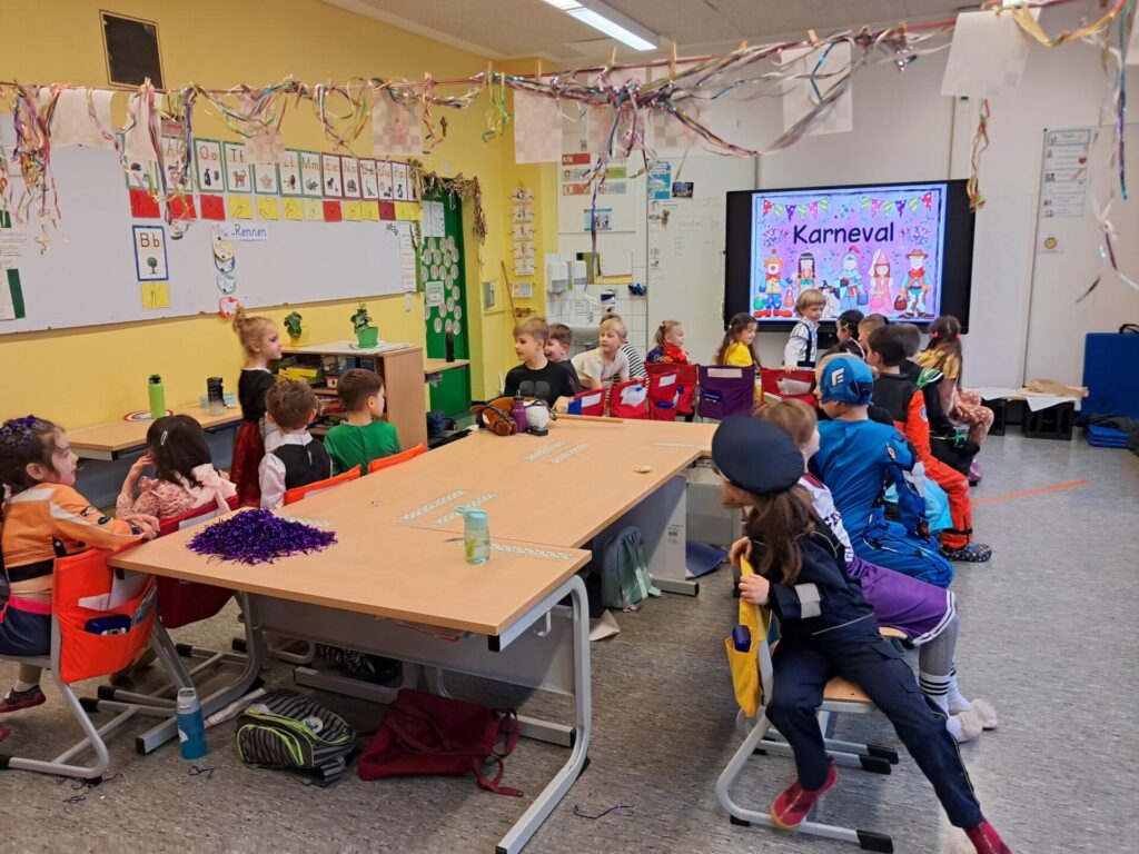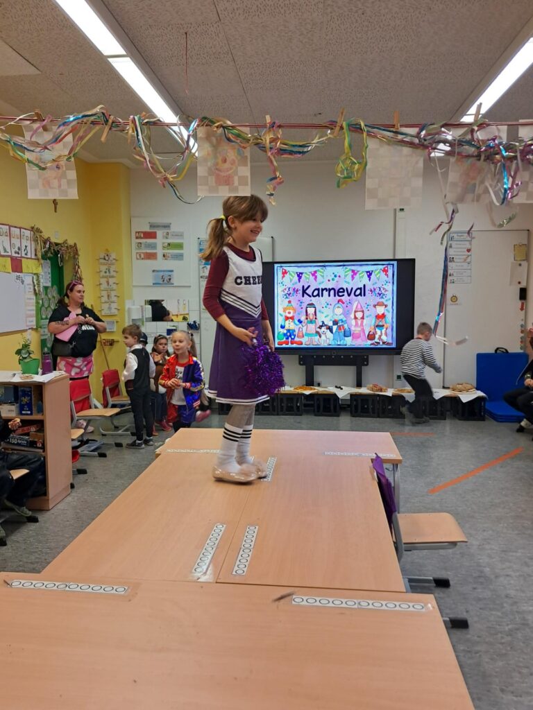 Gemeinsam mit der ganzen Schule feierten wir in der großen Sporthalle unseren ersten Schulkarneval. Anschließend feierten wir gemeinsam mit allen Mäusen im Klassenraum. Wer wollte, durfte sein Kostüm präsentieren. Wir spielten viele Spiele, tanzten und genossen unser kleines Buffet. Mäuseklasse: Helau!