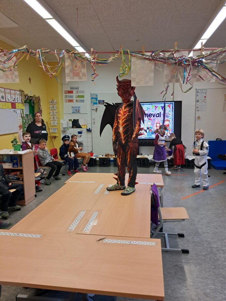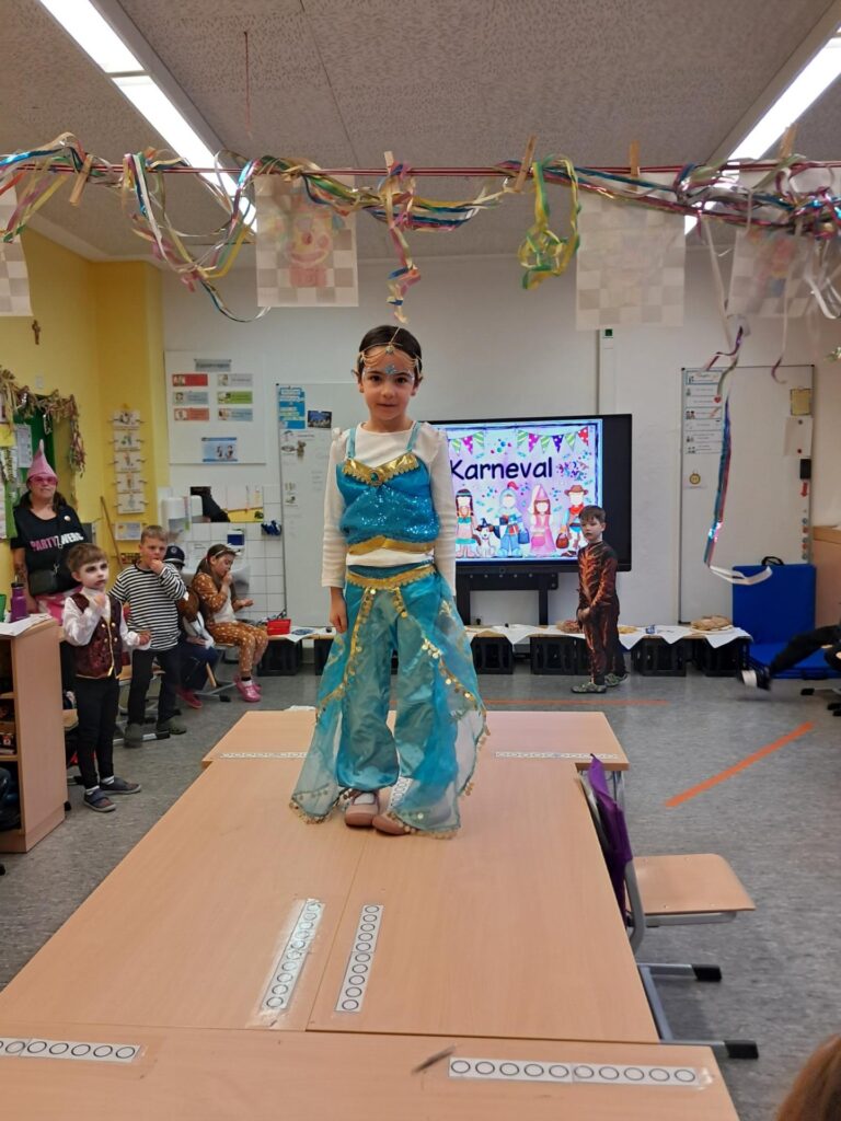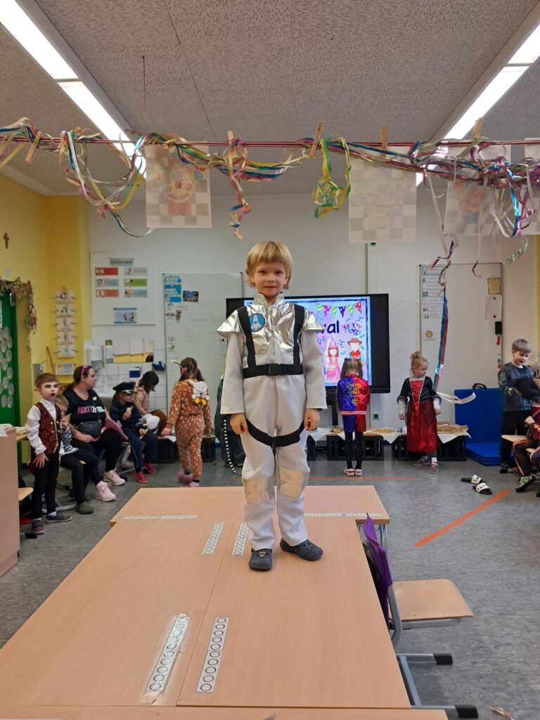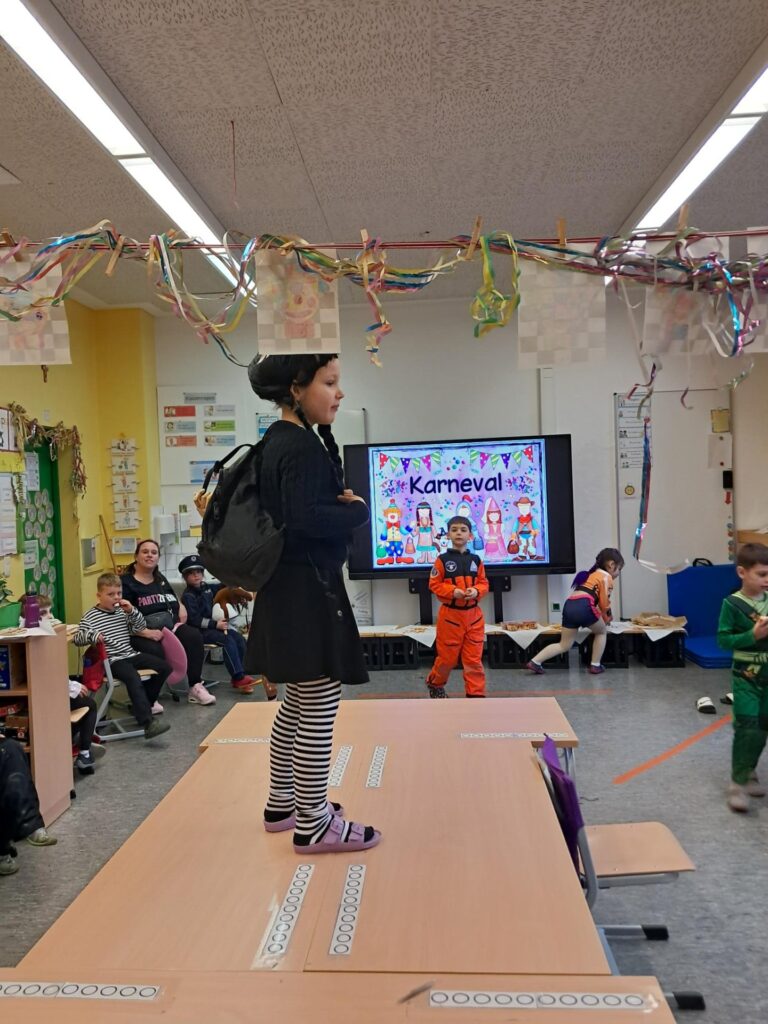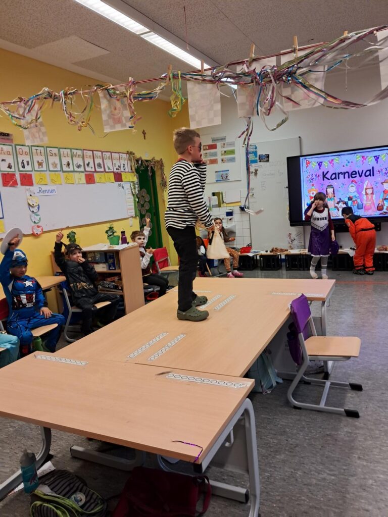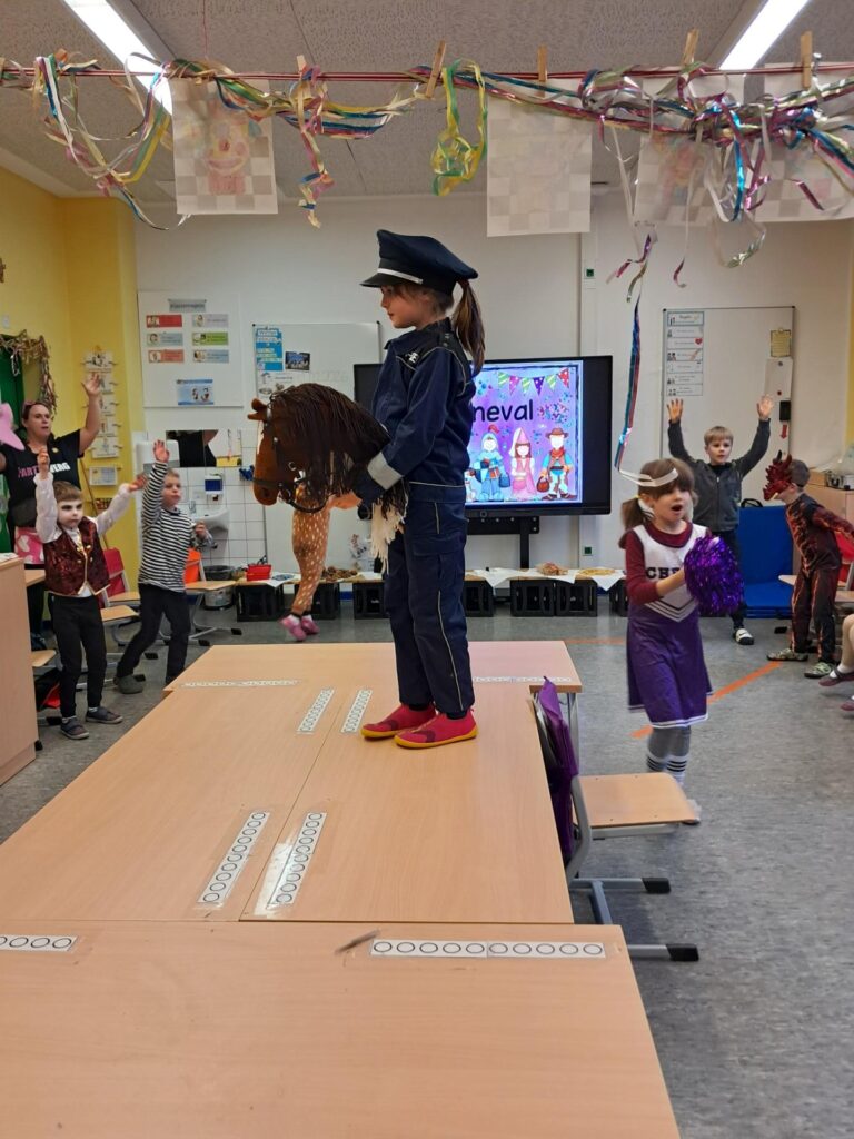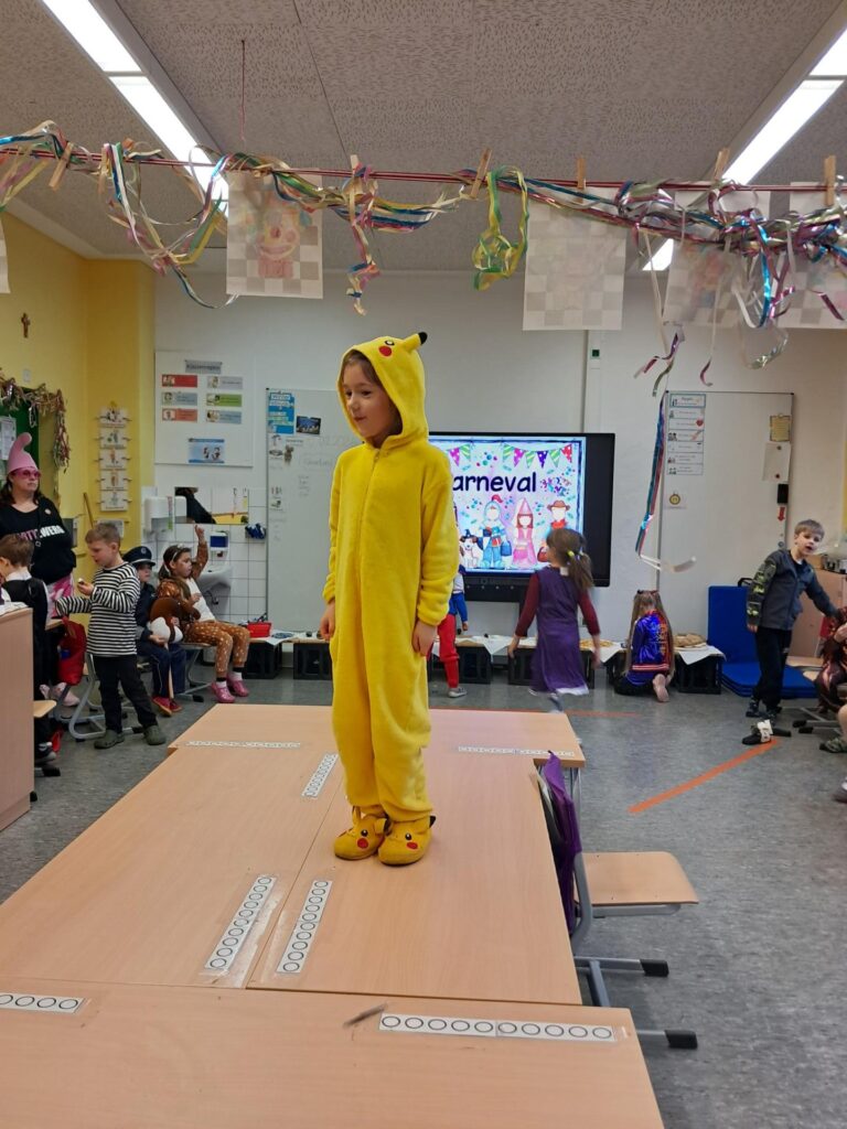 Gemeinsam mit der ganzen Schule feierten wir in der großen Sporthalle unseren ersten Schulkarneval. Anschließend feierten wir gemeinsam mit allen Mäusen im Klassenraum. Wer wollte, durfte sein Kostüm präsentieren. Wir spielten viele Spiele, tanzten und genossen unser kleines Buffet. Mäuseklasse: Helau!