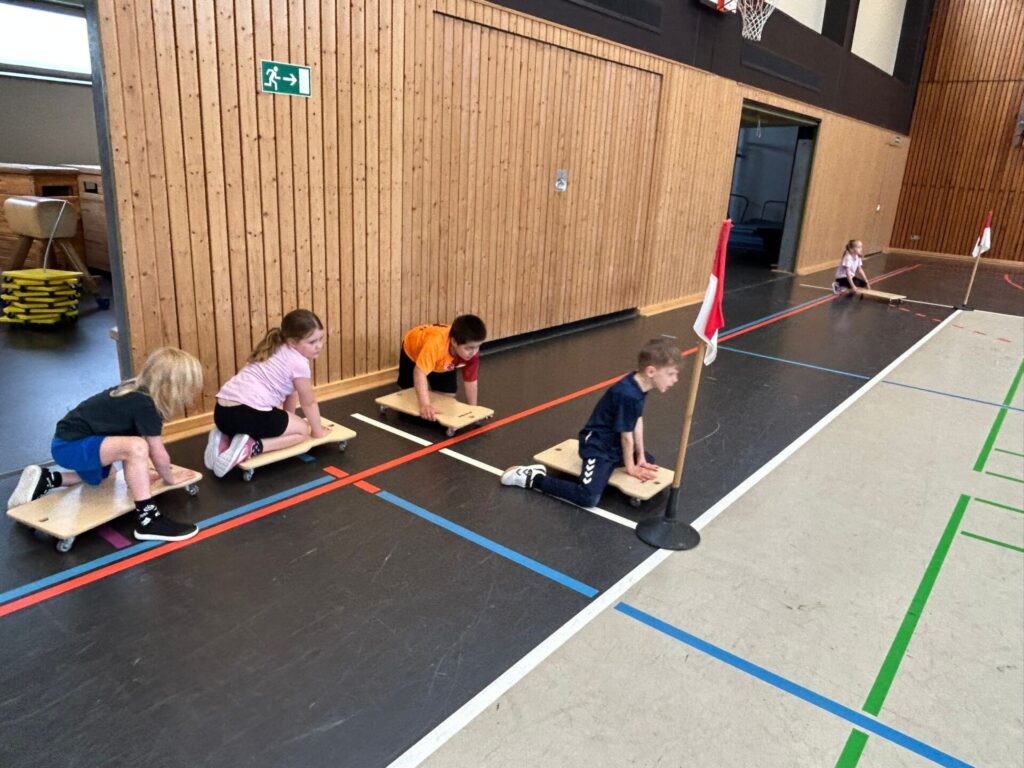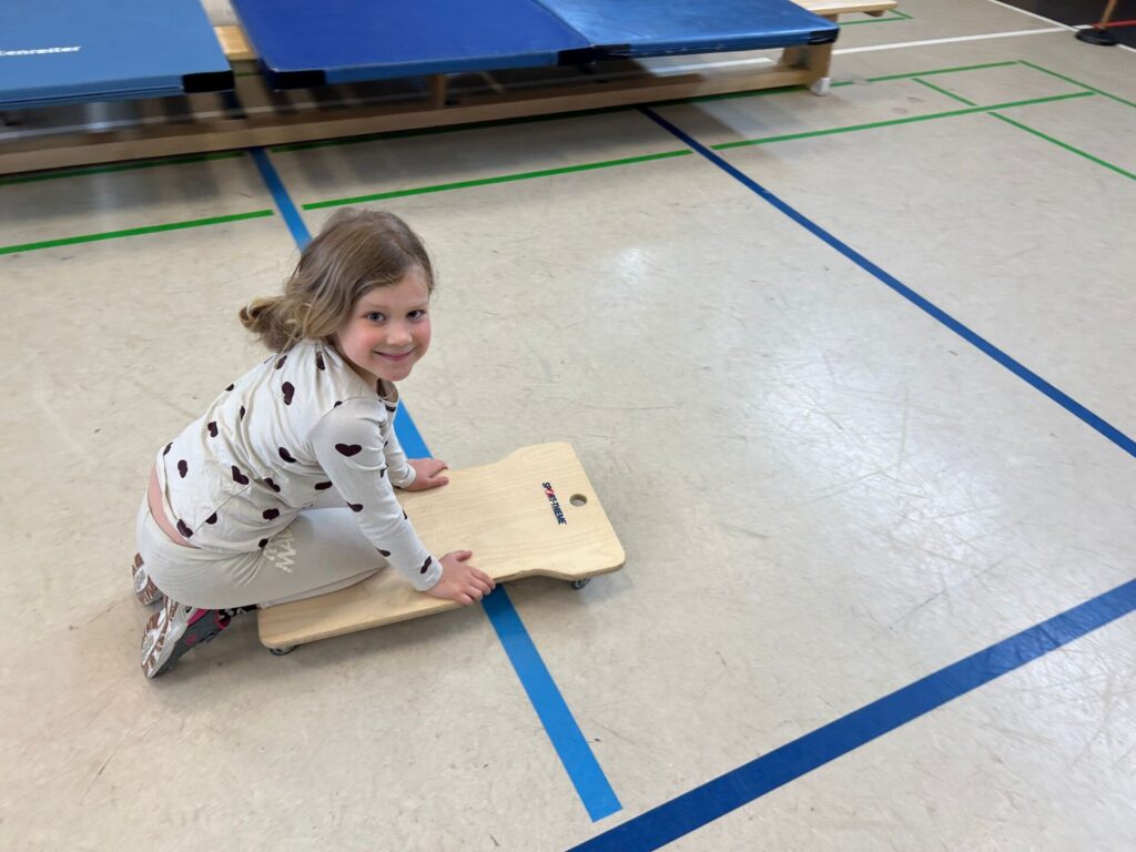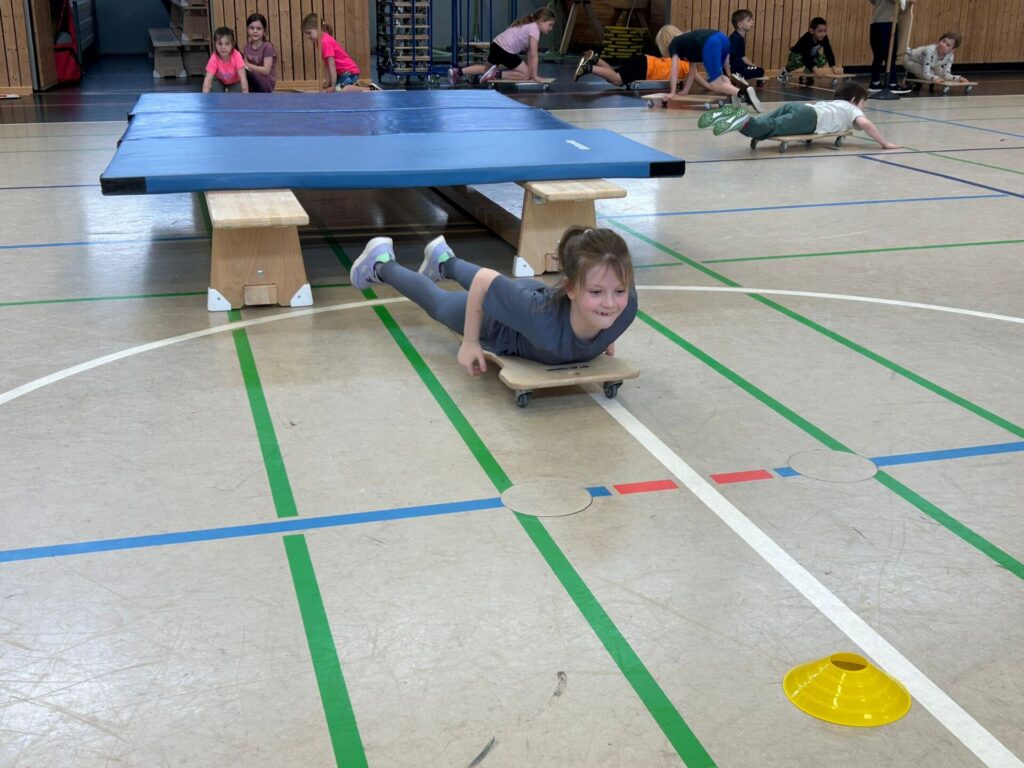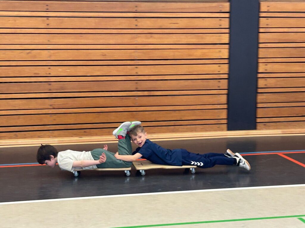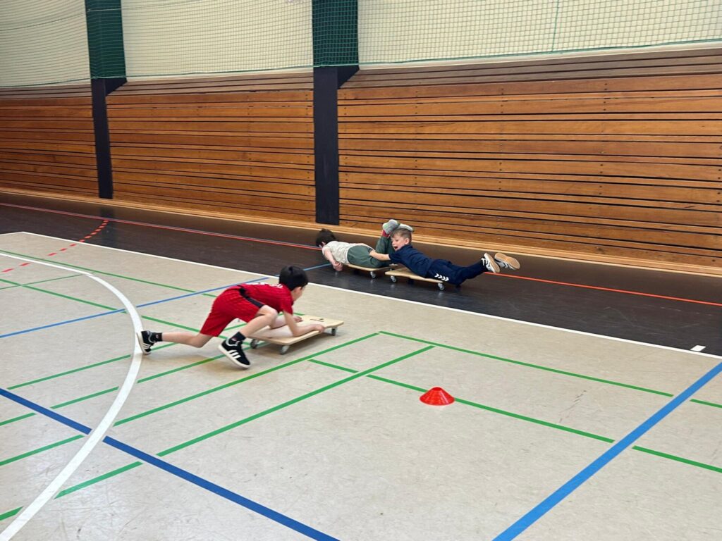 Die Erdmännchen rollen im Sportunterricht auf Brettern durch die Halle. Erst mussten sie alle wichtigen Regeln lernen und dann ging es los. Ob auf dem Bauch oder auf den Knien -hui, das war wirklich toll!