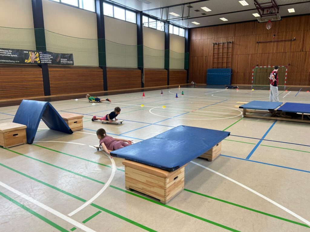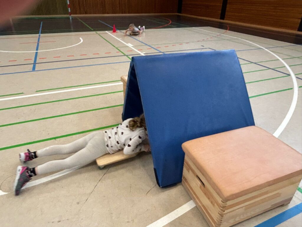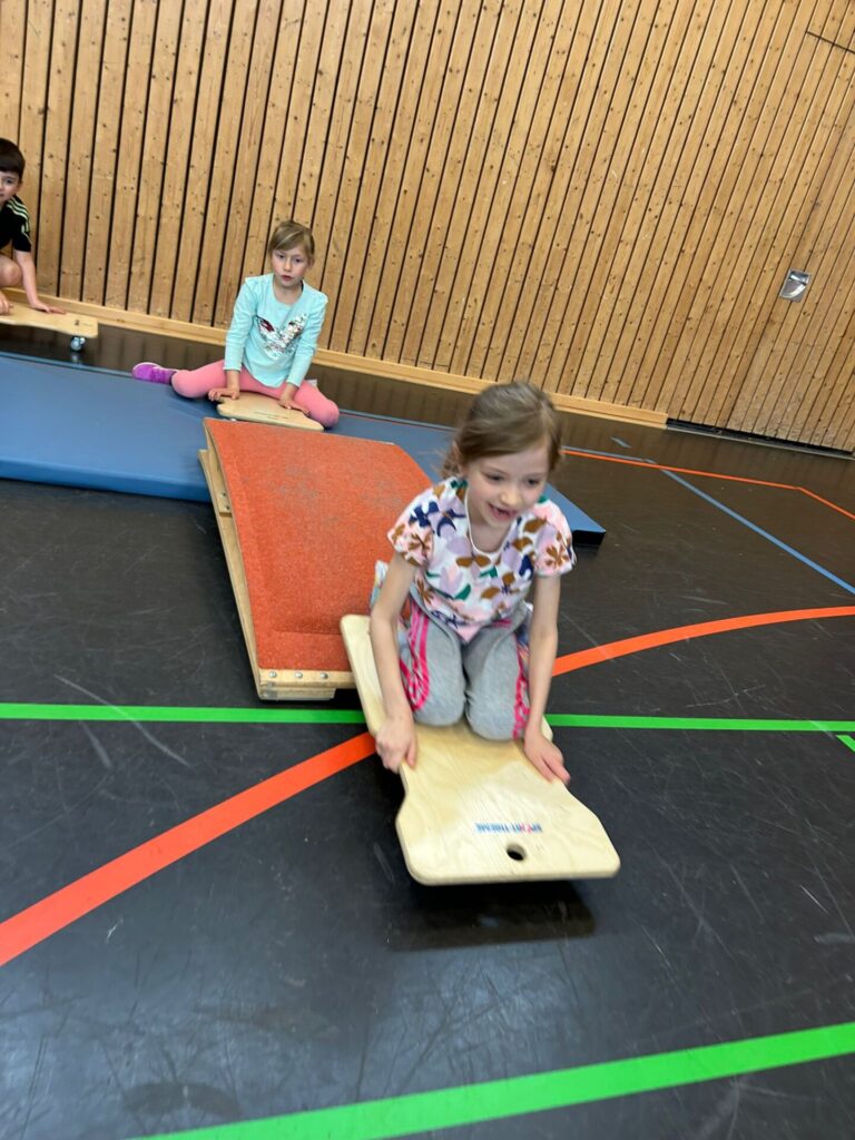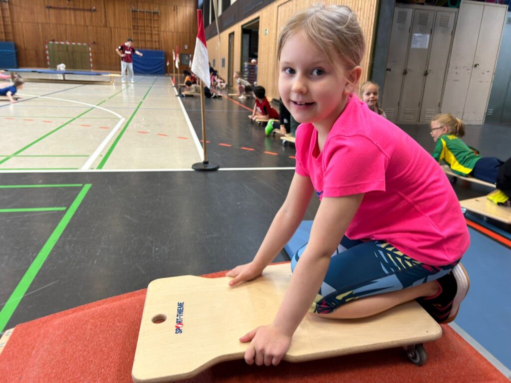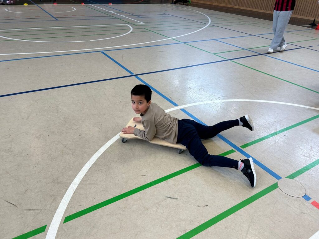 Die Erdmännchen rollen im Sportunterricht auf Brettern durch die Halle. Erst mussten sie alle wichtigen Regeln lernen und dann ging es los. Ob auf dem Bauch oder auf den Knien -hui, das war wirklich toll!